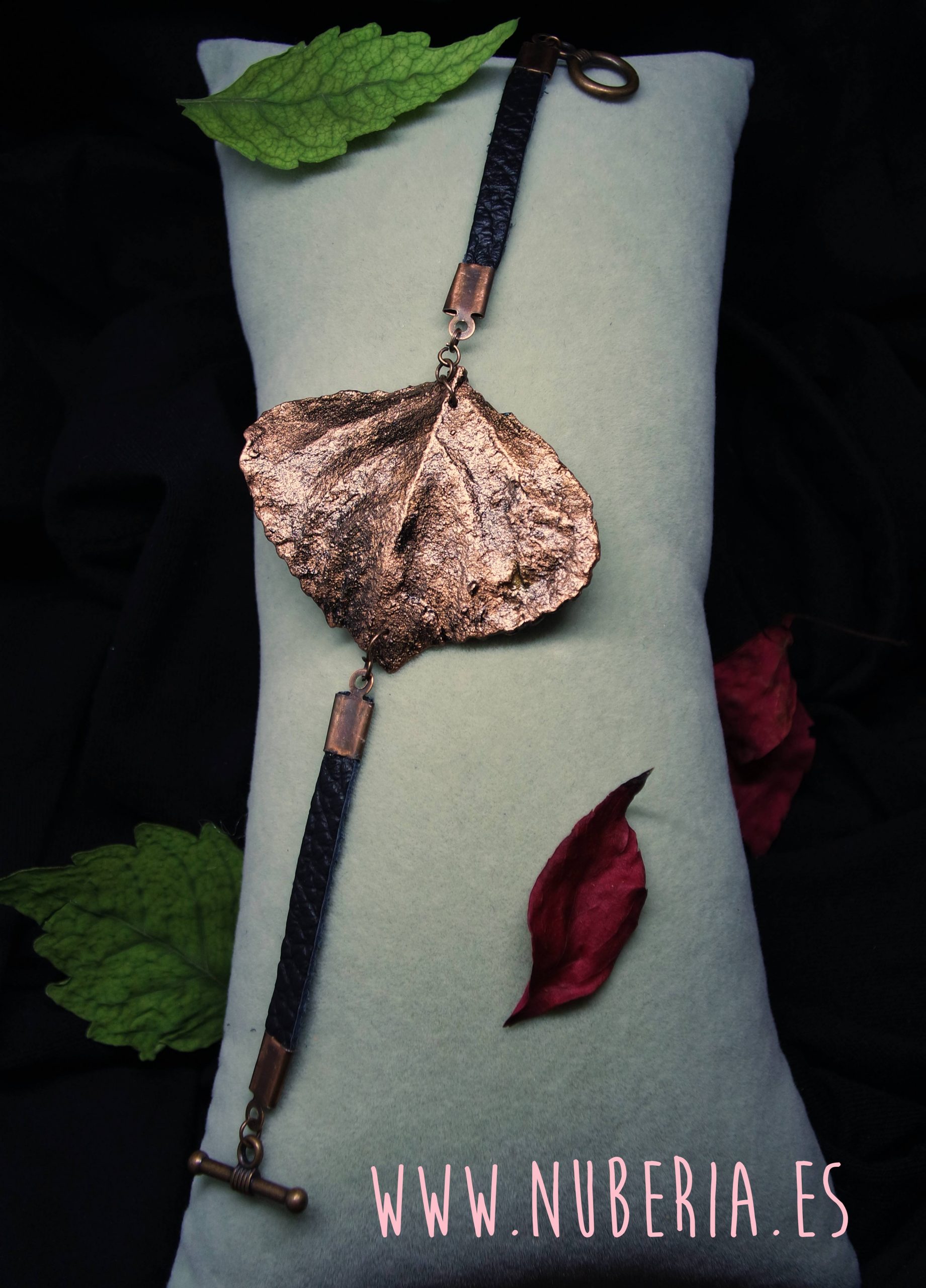 Pulsera de hoja de cobre con alma de hoja real patinada para marcar volúmenes y nervaduras. Correas de cuero negro y cierre circular